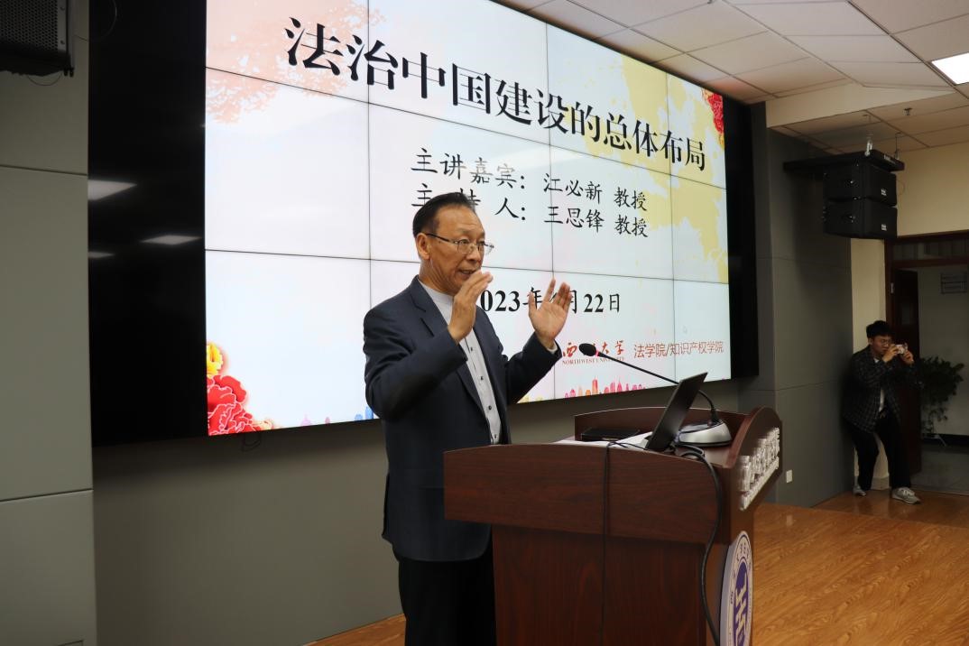 2023年4月22日下午,最高人民法院原党组副书记、副院长、审判委员会委员、二级大法官,第十三届全国人民代表大会宪法和法律委员会副主任委员,湖南大学江必新教授受邀做客我校“侯外庐学术讲座”为我院师生带来了题为“法治中国建设的总体格局”的报告。报告由学院院长王思锋教授主持,康达律师事务所西安分所管委会主任廉高波博士,学院代水平副院长、虎有泽教授、丁天立博士、苟震博士、高小芳博士、张子君博士等师生一百余人聆听了讲座。