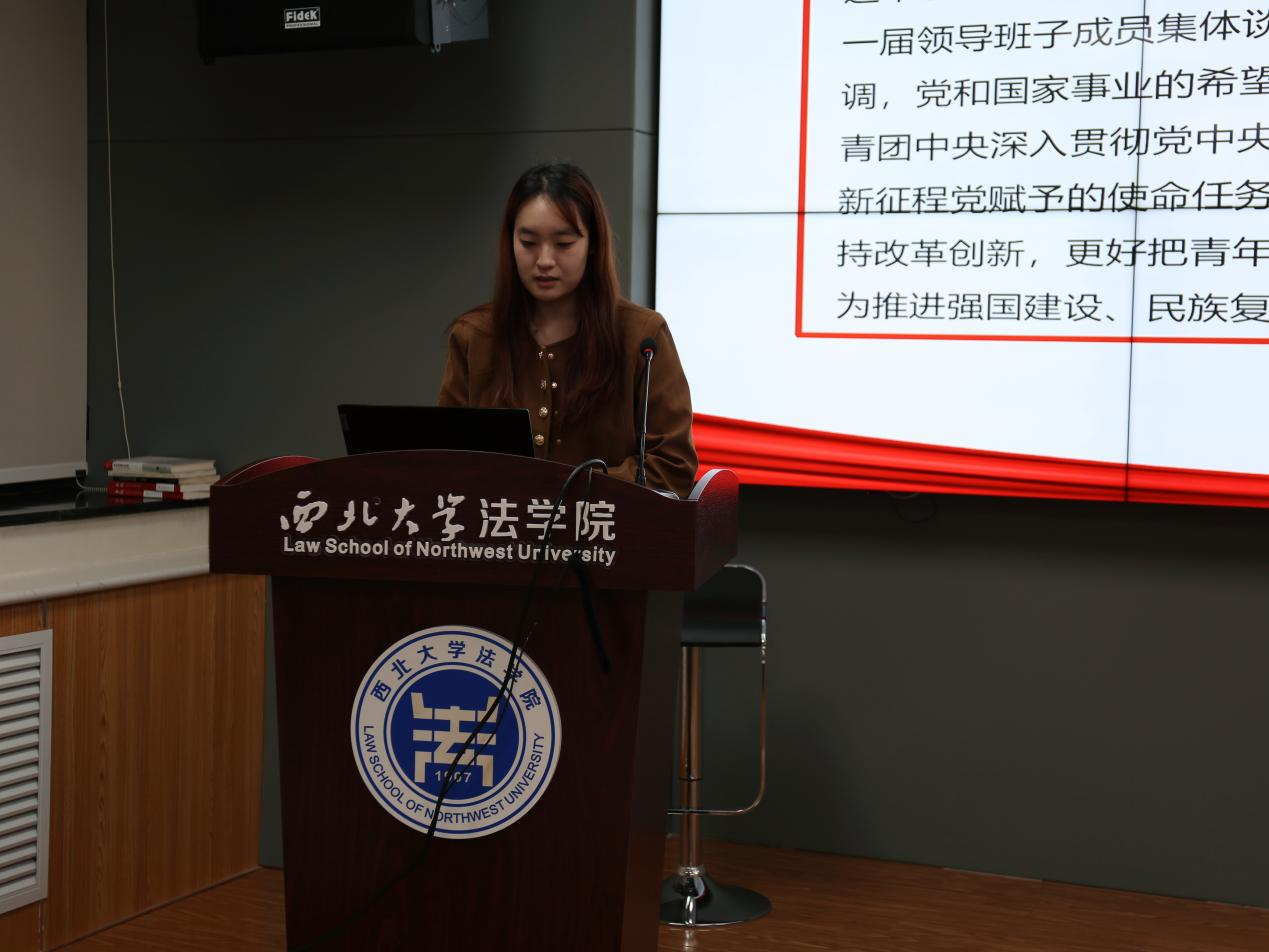 学术部杨丹同学首先介绍了大会主题为“以习近平新时代中国特色社会主义思想为指导,全面贯彻党的二十大精神,深入贯彻习近平总书记关于青年工作的重要思想,高扬理想主义,心系广大青年,锐意开拓进取,勇于自我革命,动员引领广大青年在全面建设社会主义现代化国家、全面推进中华民族伟大复兴的历史进程中挺膺担当、团结奋斗”,随后围绕在革命性磨砺中奋进的中国共青团、新时代中国青年的使命担当两个内容展开详细解读。