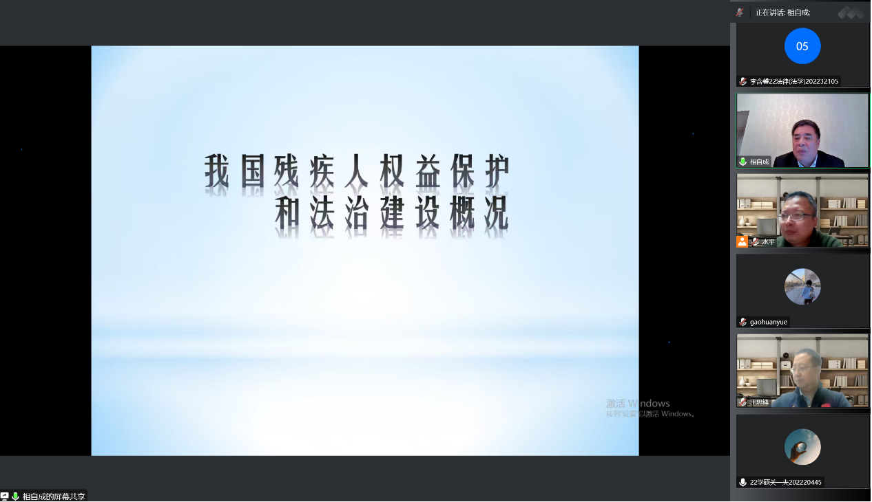 20221020日晚19点,我院特邀中国残疾人联合会第七届执行理事会副理事长、党组成员,中国消费者协会副会长相自成老师作了题为《我国残疾人权益保障和法治建设概况》的专题讲座,本次讲座以腾讯会议的形式线上进行,由学院院长王思锋教授主持,代水平副院长,2021级、2022级硕士研究生等300余名师生参加了本次讲座。