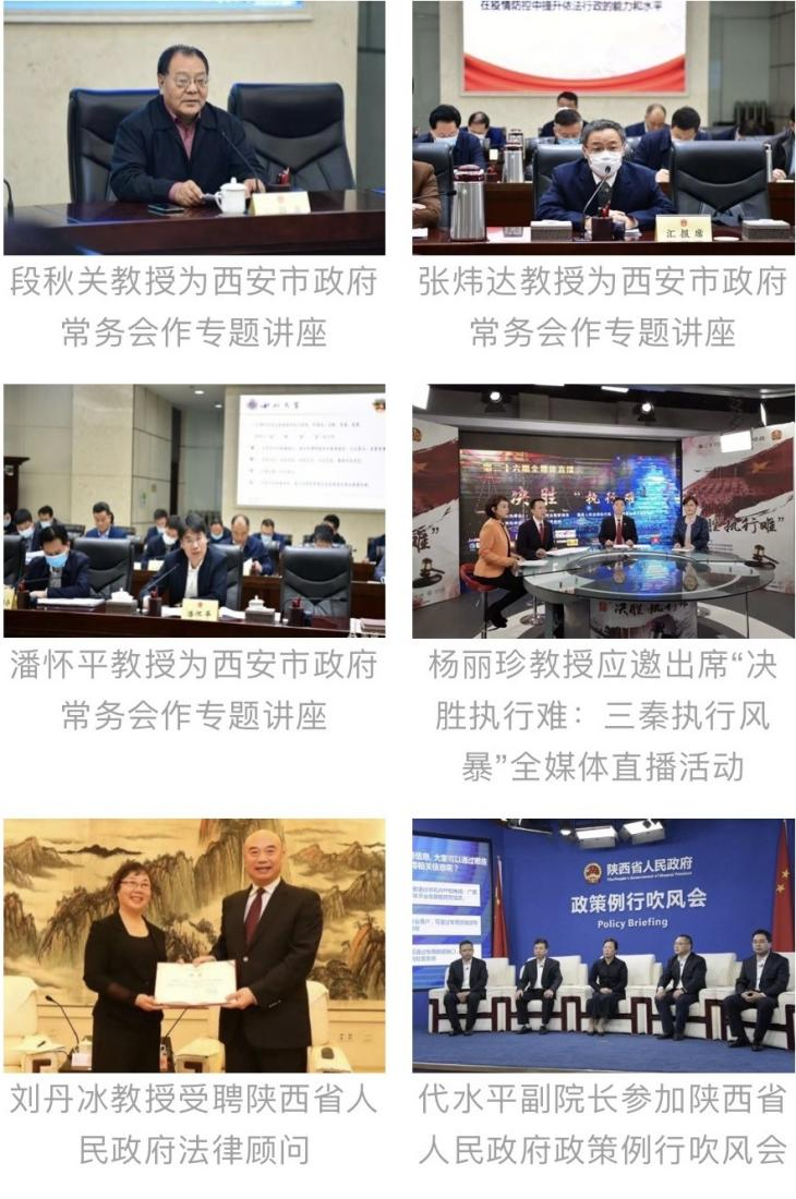 近年来,学院教师先后主持各类研究课题200余项,其中国家级项目近30项,科研经费到款近1000万元。发表各类学术论文300余篇,其中权威期刊30余篇,出版各类学术专著、教材40余部,获得各类科研奖励40余项,其中省部级奖励近20项。学院先后选派教师参加国际学术会议40余人次、国内学术会议200余人次,举办国际国内学术会议10余次,举办各类学术讲座60余场。多位教师担任省市各级立法机关、司法机关、人民政府的专家咨询员或法律顾问,积极参与有关立法和参政议政工作。与最高人民法院第六巡回法庭、陕西省高级人民法院、陕西省知识产权局、陕西省知识产权保护中心、西安市中级人民法院、国家税务总局西安市税务局、西安报业集团、商洛市人民检察院、商洛市中级人民法院、汉中市中级人民法院、榆林市中级人民法院等单位合作开展法治人才培养和科学研究,与美国、德国、英国、韩国等国家以及我国港、澳、台地区20余所著名大学保持着友好合作关系。