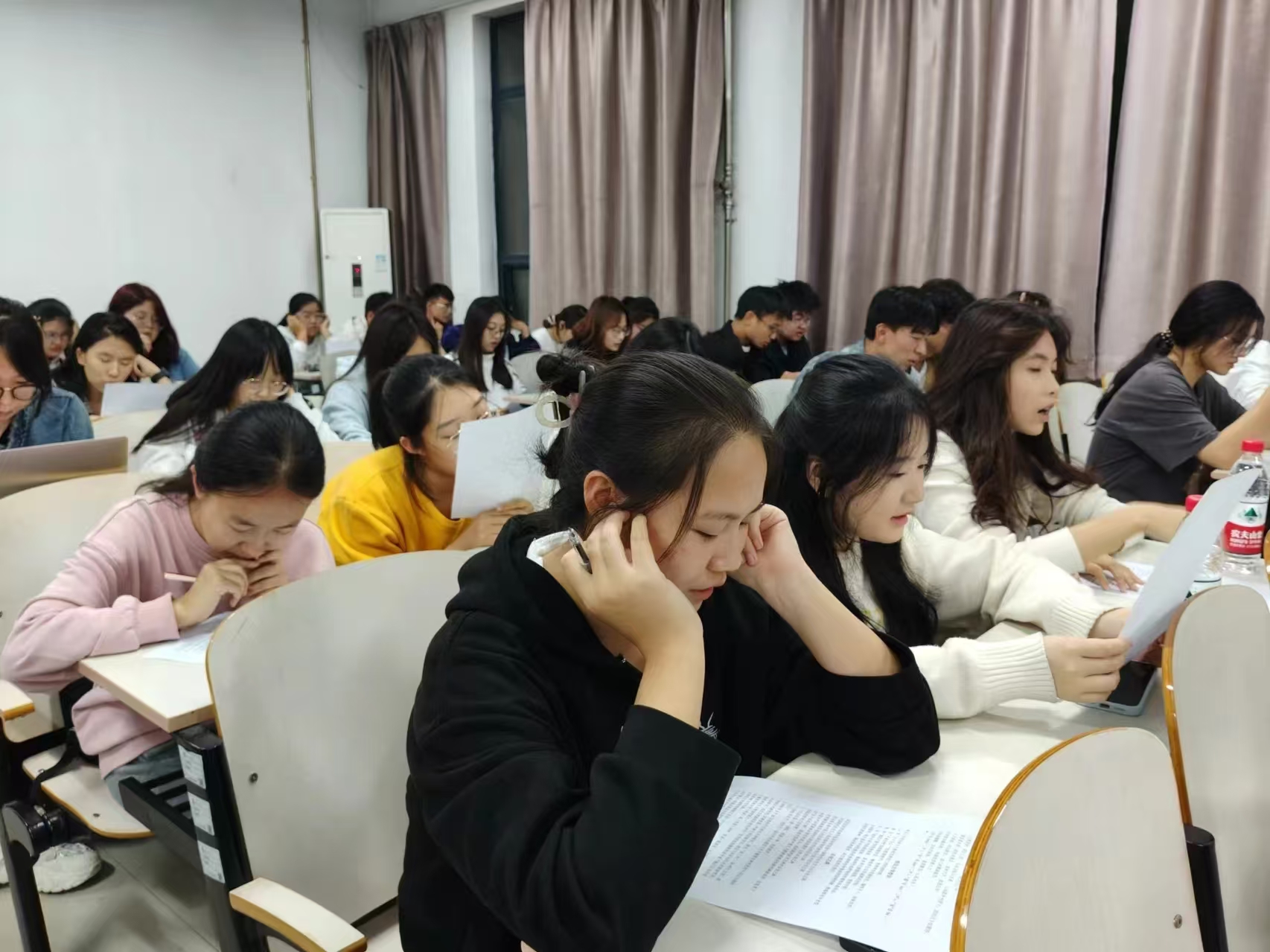 参赛者们领取到了那份承载着中国共产党光辉历史的“知识卷”,这意味着:比赛开始了!首先是记忆背诵环节,随着主持人一声令下,原本安静的教室霎时沸腾起来了!同学们聚精会神地记忆背诵,与时间赛跑,这35分钟忘我的背诵声不仅是同学们对比赛的专注,更是他们对党的铮铮赤子之心。