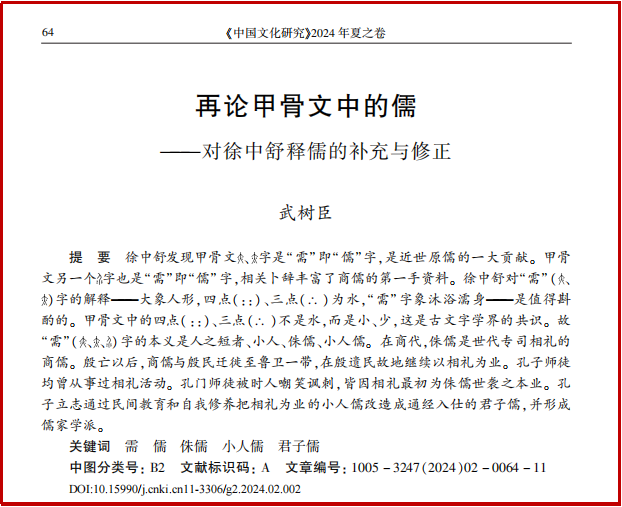 近日,我校特聘教授武树臣先生撰写的论文再论甲骨文中的儒———对徐中舒释儒的补充与修正AMI核心期刊《中国文化研究》2024年夏之卷发表。